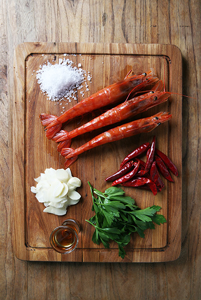 原料:阿根廷红虾6只,蒜8枚,橄榄油100克,欧芹10克,白兰地30毫升,干辣椒2枚,辅料:欧芹、大蒜少许