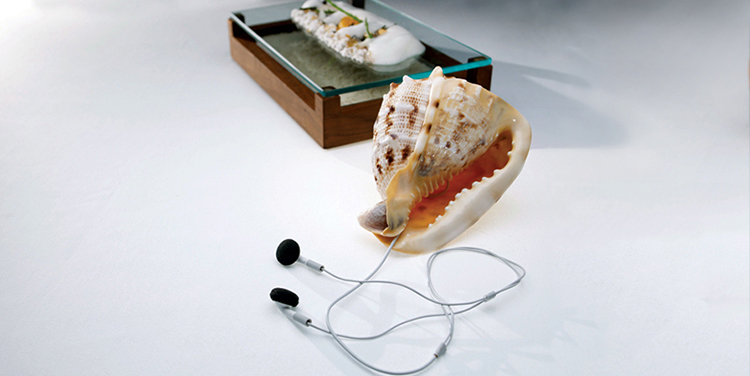 英国米其林三星餐厅Fat Duck在墨尔本店中的菜单采用多感官的创作。这道“海的声音”是餐厅的招牌,一盘雕刻装盘的海鲜,搭配着海草和面包屑制作的“沙滩”,菜品整体展现了海的腥味、苦臭味、甜味、咸味与鲜味。