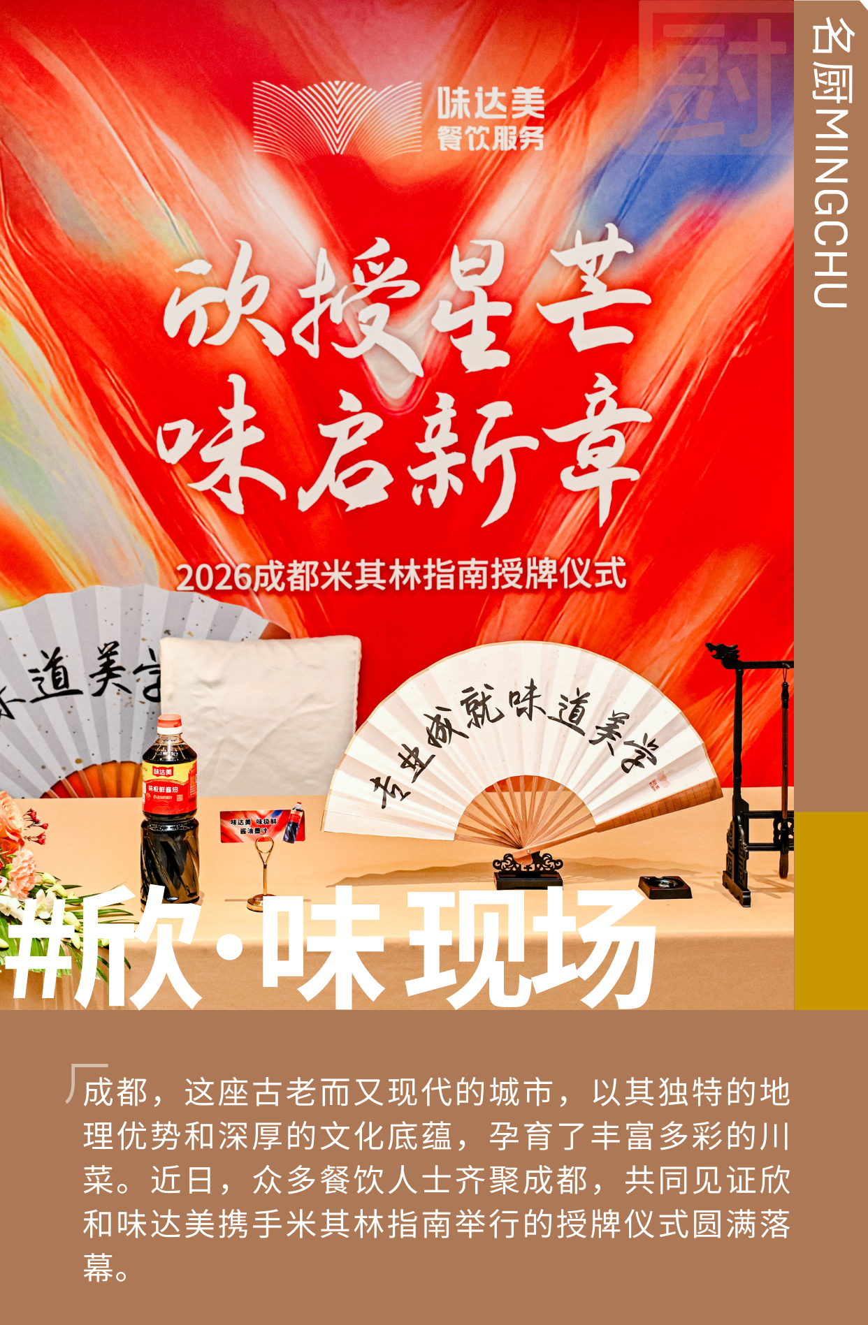 12 月 23 日,2026 成都米其林指南授牌仪式在成都丽思卡尔顿酒店成功举办。欣和集团作为 2025-2026 米其林指南中国大陆地区首席合作伙伴,获得独家授权;旗下味达美餐饮服务品牌为米其林指南获奖餐厅颁发奖牌。