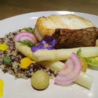 Roast France Cod ,White Asparagus ,Quinoa , Potato Confit