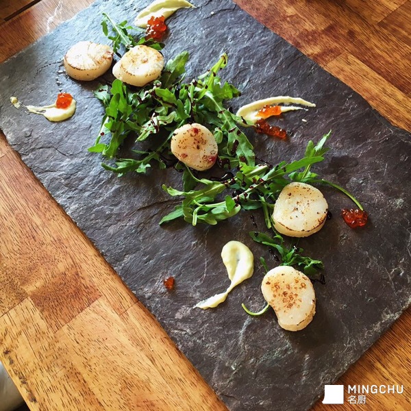 焯扇贝配芝麻菜和青芥蛋黄酱