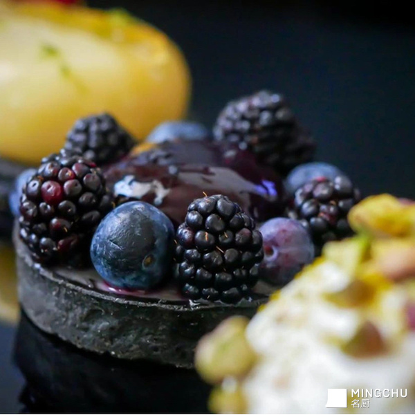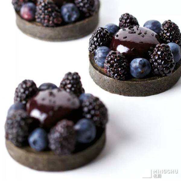1、将冷冻脱模的半球形“蓝莓黑莓啫喱”放在挞的表面正中心位置,边缘交叉摆满蓝莓和黑莓。