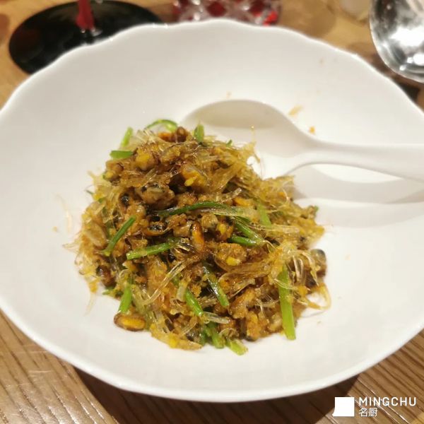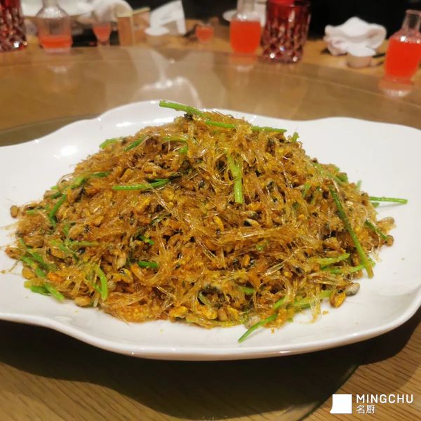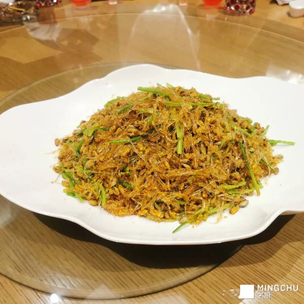 传统都是金汤,浓汤鱼翅,今天来个干捞鱼翅,干香扑鼻,鱼翅挂上蛋黄碎,加上薄壳米口感更丰富。