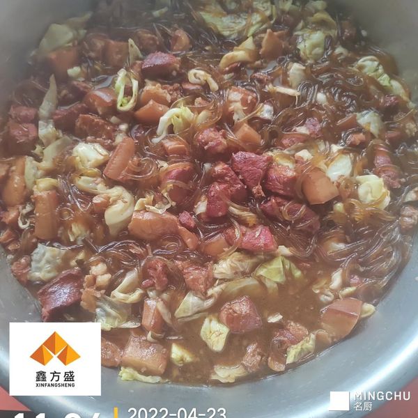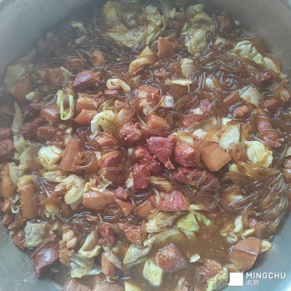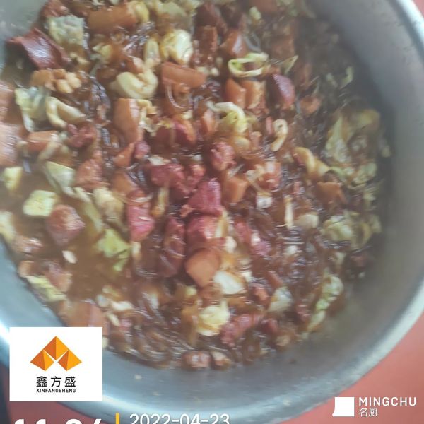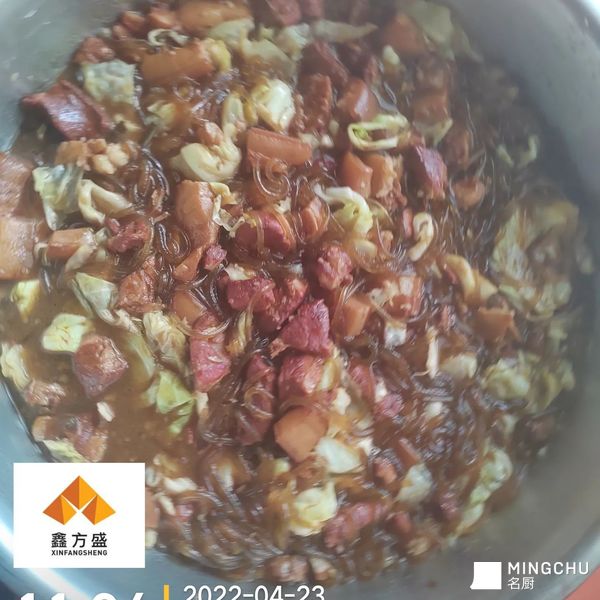前腿肉切块焯水洗净炒糖色放肉炒上色加开水盐炖40分钟放粉条白菜炖熟即可!