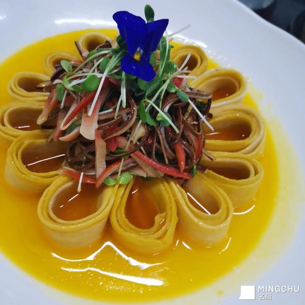 茭白与金酸汤的结合,搭配了黑豆丝与赤贝。提现了海鲜与蔬菜的完美搭配