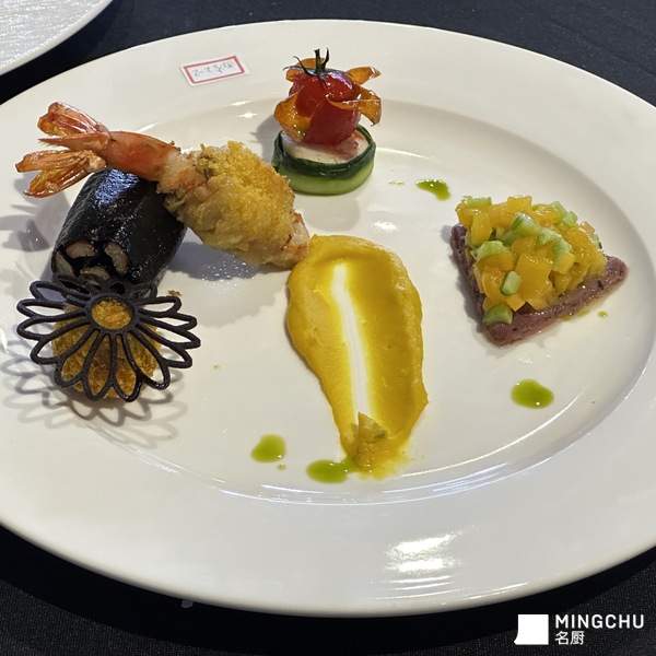 第七届HOTELEX”明日之星“厨师大赛 中国国际烹饪技能职业联赛华东赛区预选赛——西餐热菜「作品全称」大理石海苔蟹柳卷配香酥酥皮黑虎虾,佐鱼肉虾球配青瓜虾仁,佐圣女果配藜麦覆盆子饼底,搭芒果沙沙,配莳萝绿油佐南瓜泥酱