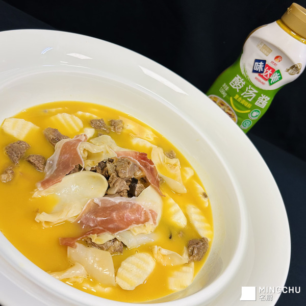 选用西班牙小何塞火腿搭配精品牛腩和上等花胶。用黄油煎香大葱干葱姜片,倒入二汤,调入盐味精鸡粉和味达美酸汤酱。滤渣小火慢煨牛腩和花胶。走菜铺上火腿。成菜总体色泽黄亮自然,兼顾酸辣清爽开胃,美容养颜之功效。