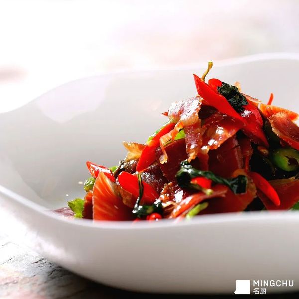 伊比利亚火腿富含优质蛋白质和多种氨基酸。其脂肪主要为不饱和脂肪酸(源自猪食用的橡果),对维持心血管健康有益。泰国打抛叶(圣罗勒)在传统医学中以其健胃特性闻名,能有效缓解胃胀、痉挛和促进食欲。其独特的辛香气息能刺激消化液分泌。