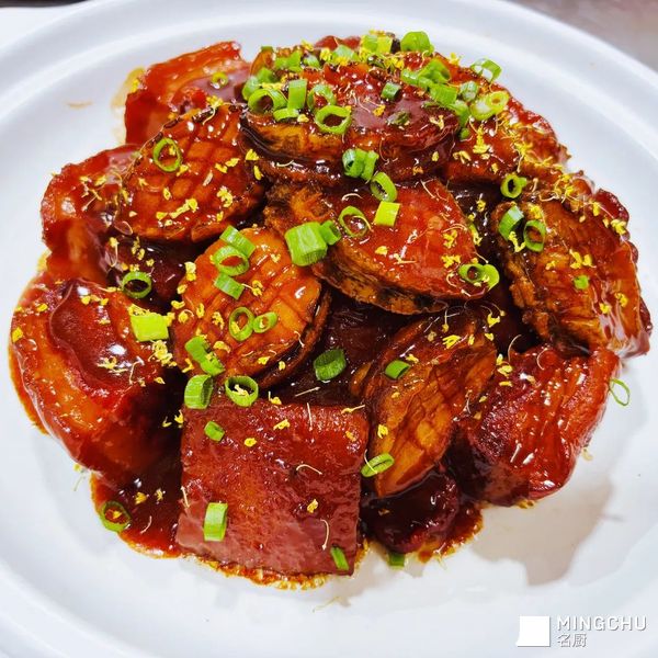 此菜在传统的东坡肉上加以改进,主要用冰糖老抽和古越龙山花雕酒小火慢炖而成,味道香甜可口,通勤红烧肉肥而不腻,酱味浓郁,在加上干桂花的点赞,也给此菜增加了气氛和创新的寓意。