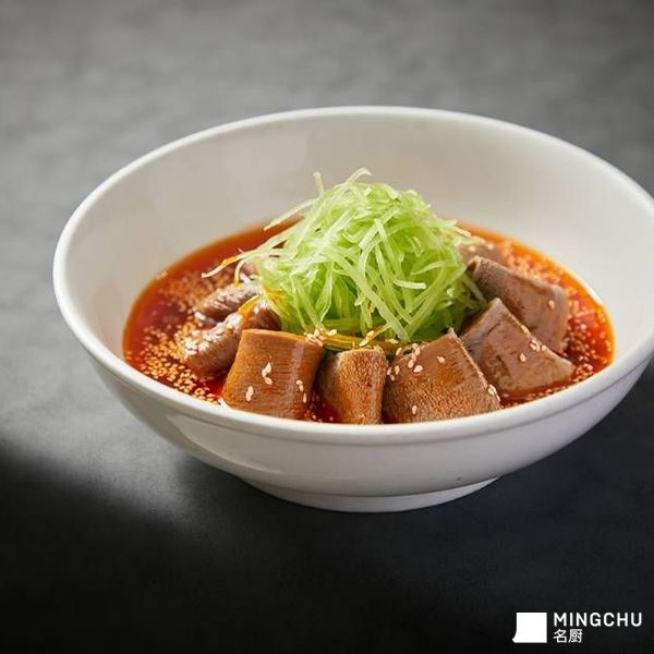 牛舌经过精心处理后切片,浸泡在红亮的麻辣汤汁中,汤汁里点缀着白芝麻,增添了香气与口感层次。顶部铺以清新的莴笋丝,既丰富了色彩,又以清爽的口感中和了牛舌的醇厚与汤汁的麻辣,整体呈现出麻辣鲜香、口感丰富的特点,是一道很有特色的开胃凉菜。