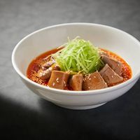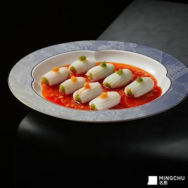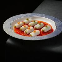 花枝卷为主要原料,经处理后卷制而成,搭配青笋等蔬菜丝增加口感层次。蒜香浓郁,红油赋予其艳丽色泽与香辣口感,花枝卷本身脆嫩弹牙,在红油蒜汁的包裹下,鲜香与麻辣交融,口味丰富且极具冲击力。盛放在带有花纹的精致瓷盘中,红亮的蒜汁衬得花枝卷洁白雅致,点缀的绿色和橙色配料更提升了视觉美感,是一道兼具颜值与口味的佳肴。
