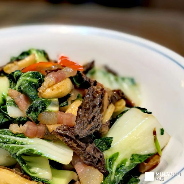 青菜腊肉炒羊肚菌