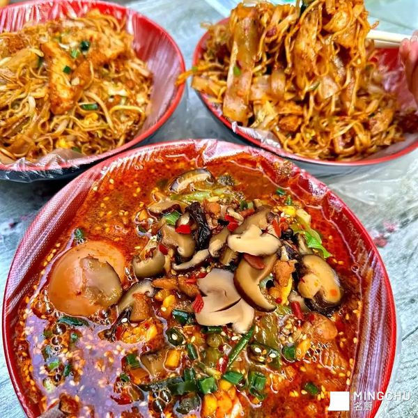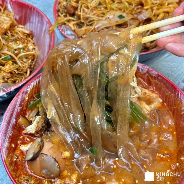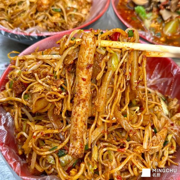 你说它是炒面吧,它里头藏着软糯的凉皮;你说它是炒饼吧,它又混进了多孔的面筋;你刚尝出点炒河粉的滑溜,冷不丁又被一块韧劲十足的擀面皮拦住了牙齿。它就像一个“碳水化合物的江湖”,三教九流,各有各的门道,却在孜然和辣椒油的调和下,莫名其妙地结成了“风味同盟”。