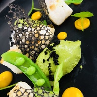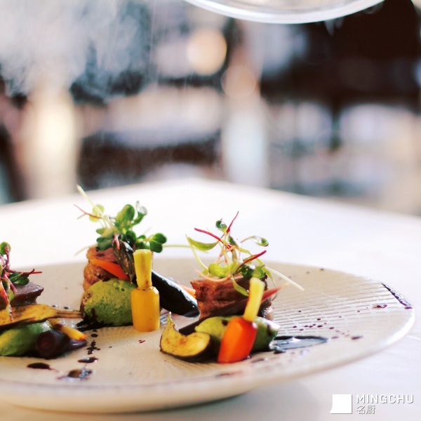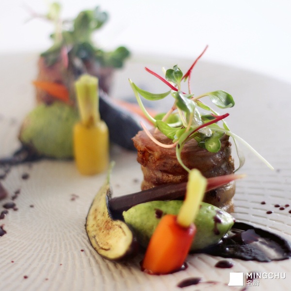 烟熏低温小牛里脊配黑蒜泥,橄榄青豆及红酒汁