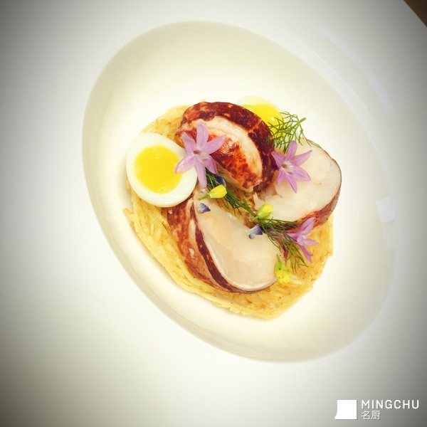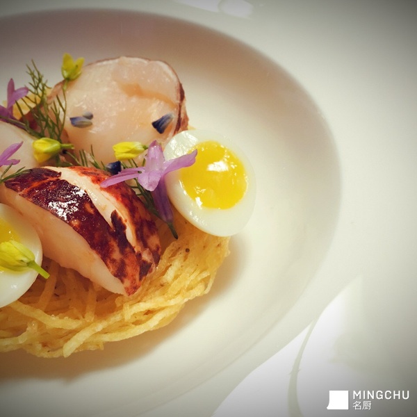 恒温布列塔尼蓝龙虾,土豆丝脆饼,奶油龙虾汁,溏心鹌鹑蛋,香气食用花草