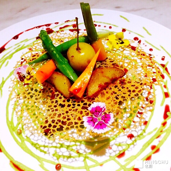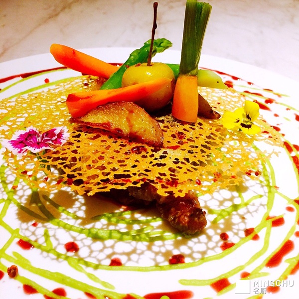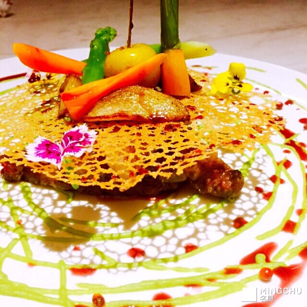 和牛肉眼的肉汁搭配焦糖苹果的甜脆口感再加上红酒汁的香气。