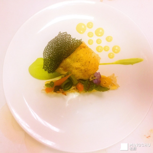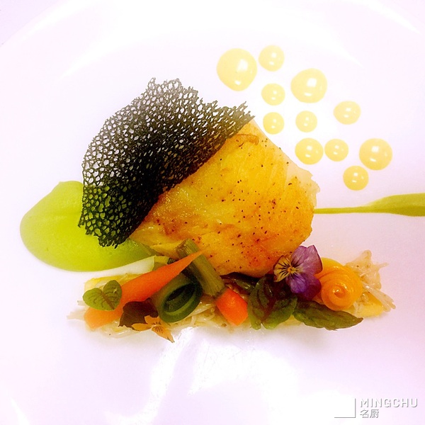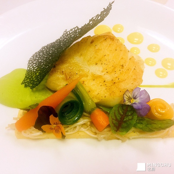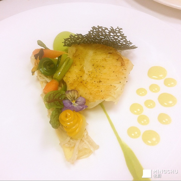 鳕鱼配玉米饼,金针菇及黄油汁