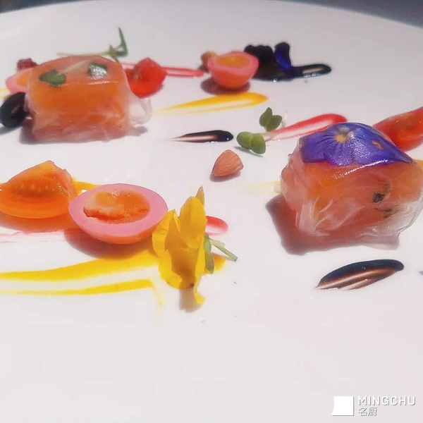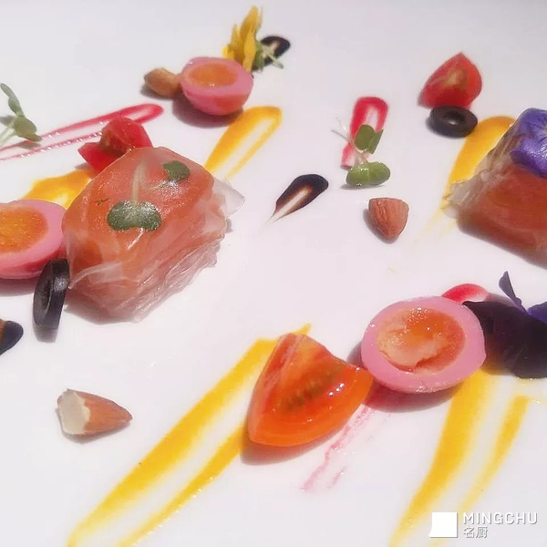 腌制三文鱼配红菜头鸳鸯蛋 话梅番茄