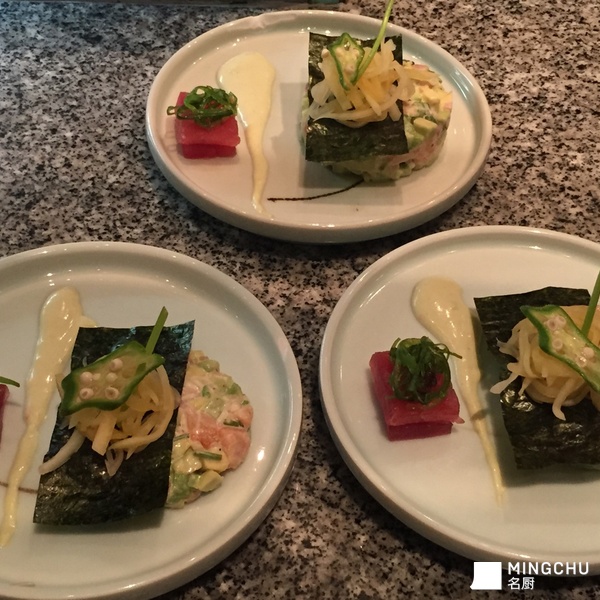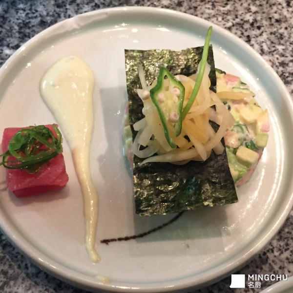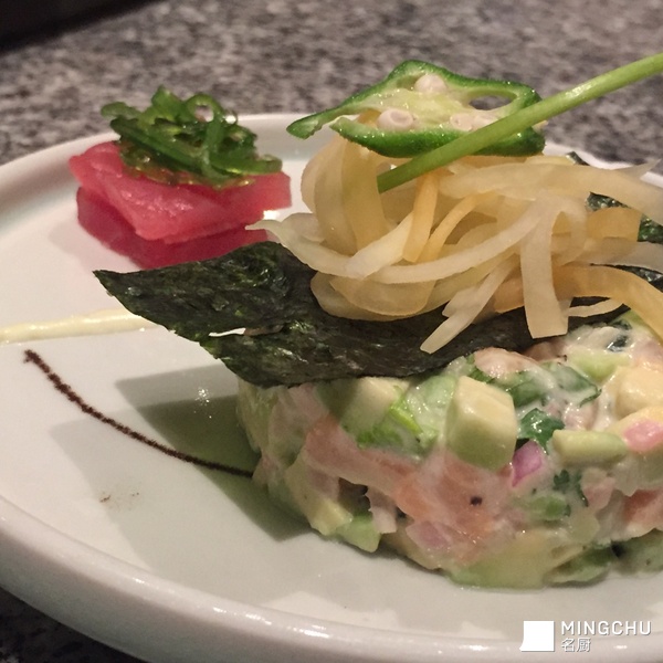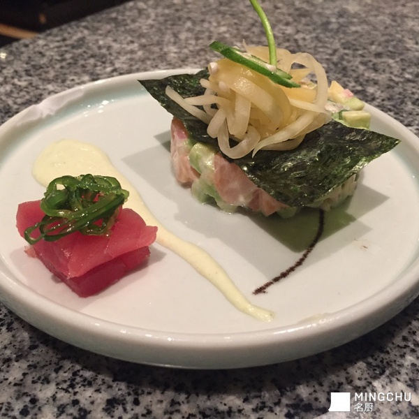 挪威三文鱼塔塔配生淹蓝旗金枪鱼柳