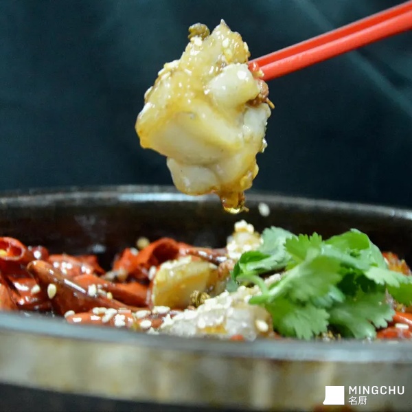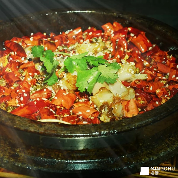 灵感来源于沸腾鱼 利用石锅和油温的温度来烹饪保证了蛙的原汁原味及口感 是一道色相味及全的菜品