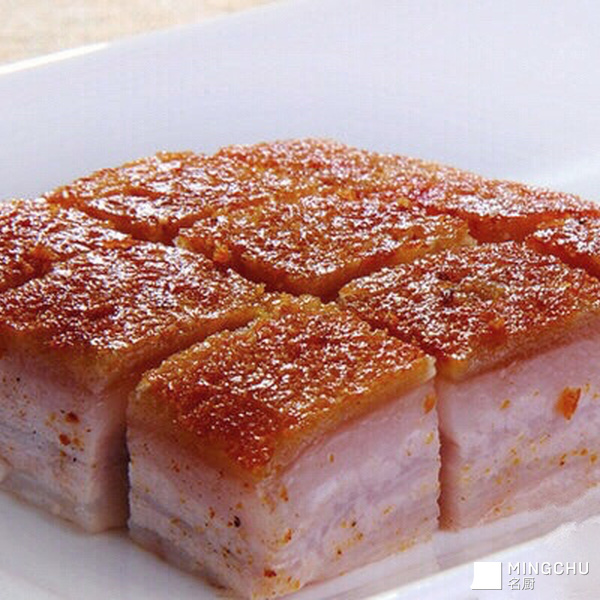 澳门烧肉又称白切烧肉,是近十年来五香烧肉的改良创新品种,口感以其甘香酥脆而著称。肉放在冷水里煮,目的是让肉质成熟且带有一定水分,这样烘烤时瘦肉部分才不会发柴。但煮的时间不能过长,这样的一块肉我大约用中火煮了8分钟,如果时间过长的话,肉皮很容易会变黄卷曲; 在肉皮上扎眼,小孔越细密,烤好的烧肉表面才会酥化,看起来像蜂窝状,但是不可用力过大将肉皮戳烂。在肉皮上涂上小苏打也是使其酥化的作用,这个很关键,不能省略。