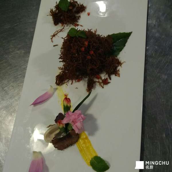 此菜品选用云南野生树花菌,再加入营养价值很高的黄桃泥。口感酸爽微麻辣,食材绿色健康养生开胃