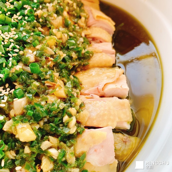 精选清远鸡,反复两次煮泡,冰镇,使得鸡皮Q弹,烧椒酱用青指尖椒,一定要带有辣味,还有上好的青花椒。
