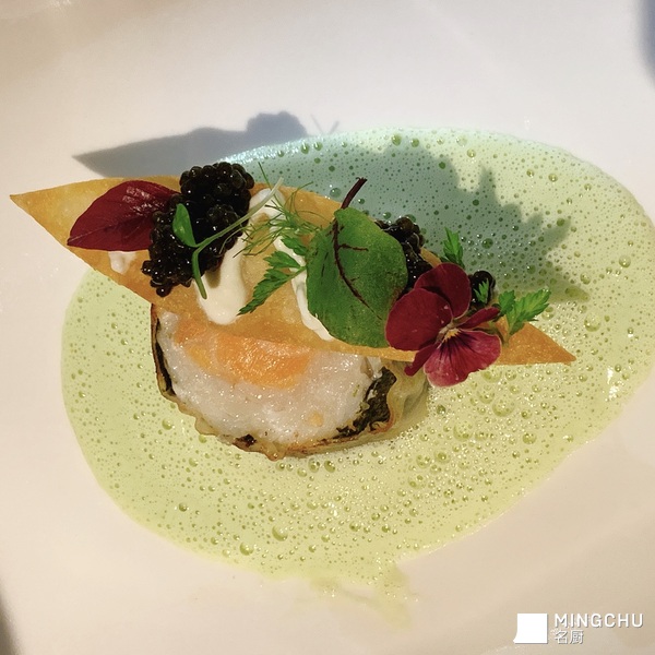 脆皮鳕鱼,三文鱼卷,卡露伽鱼子酱,西洋菜泡沫