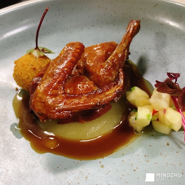 脆皮乳鸽,云尼拿香草苹果泥,松露薯球,热带凤梨莎莎,鸡烧汁