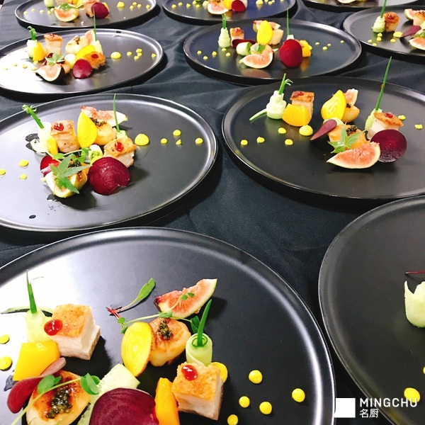 澳门脆皮腩肉,煎澳洲带子,无花果,糖渍黄桃