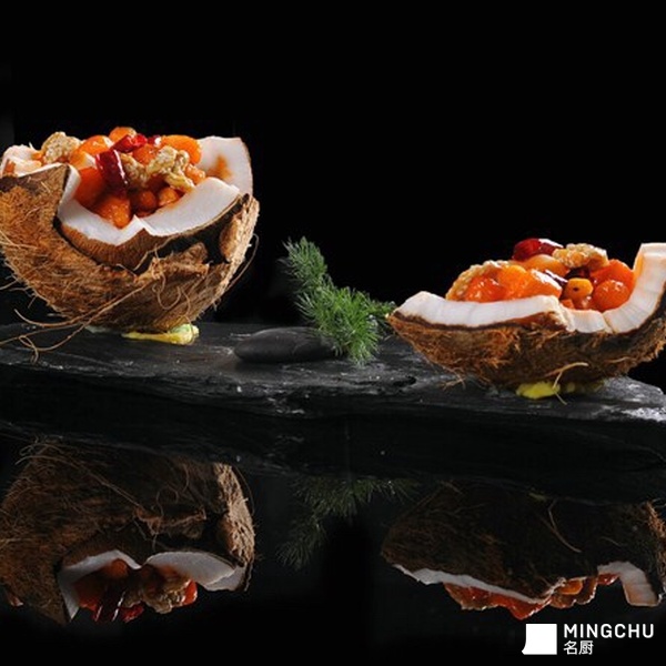 顶级食材用川菜传统手法制作。椰子的香气融合了川菜传统味型——糊辣荔枝味。结合两种风味的法国鹅肝,用新鲜毛椰摆盘,成菜大气,搭配巧妙。温馨提示:鹅肝胆固醇较高,不适合老年人以及胆固醇过高人群。鹅肝过油时,油温不宜太低,否则影响出品效果。