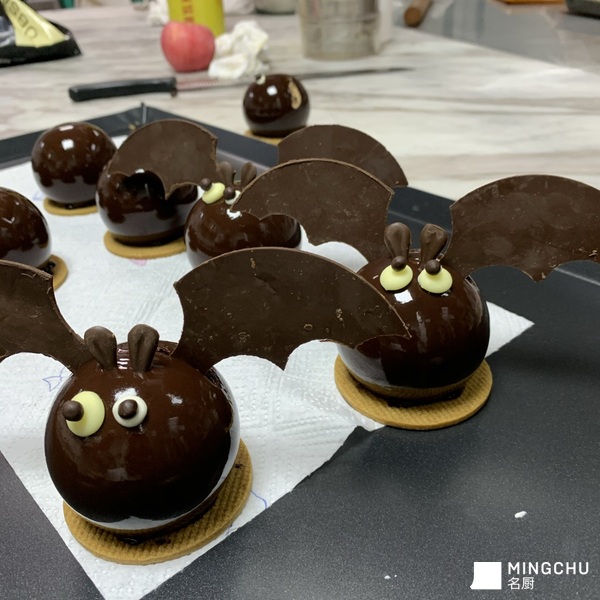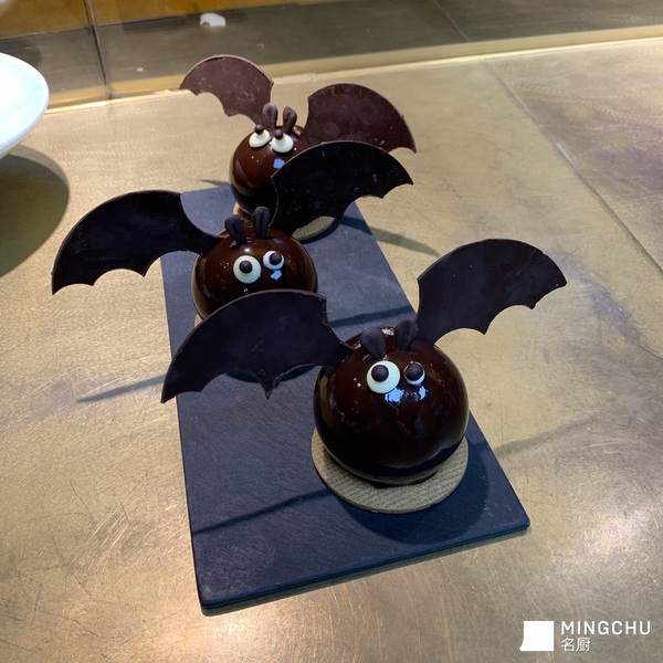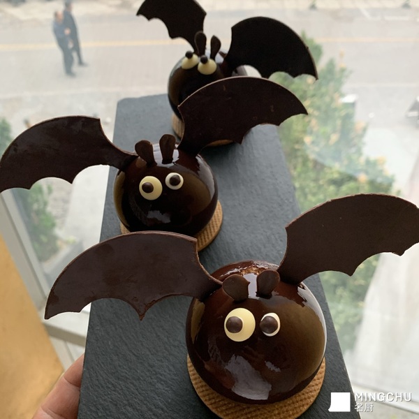 万圣节的蝙蝠巧克力慕斯,风味用焦糖巧克力,与橙子风味夹心~