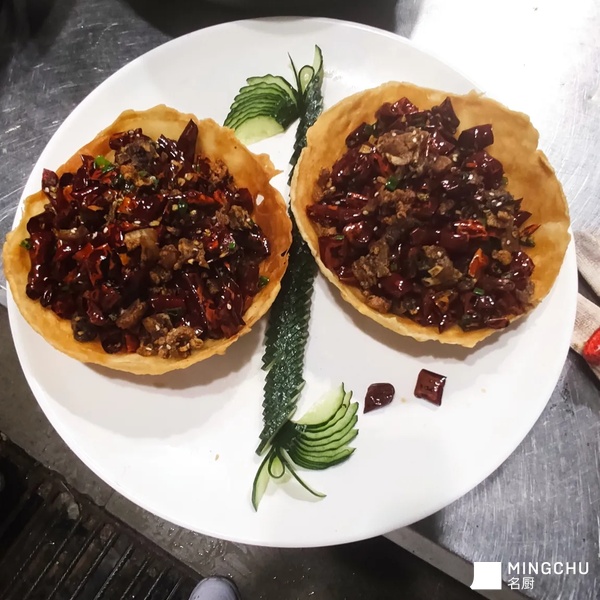 辣子鸡是山城辣子鸡略做改动而成,配上脆碗更香,佐酒下饭都可以。