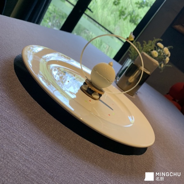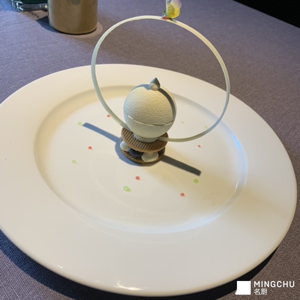 柚子味中空的慕斯球,一半填充桃子汁酱,一半填充燕窝,