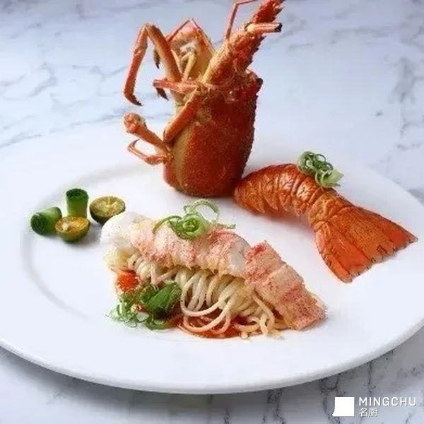 2.龙虾取肉,头尾过油上色;黄瓜、胡罗卜切片卷筒;小青柠对破;葱切成花和丝;面条煮熟待用。