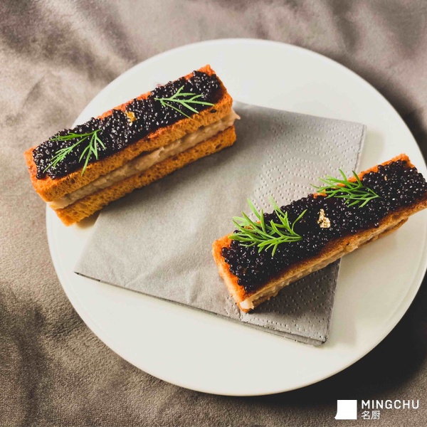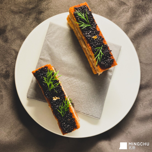 布里欧面包刷上奶油烤到酥脆,蒸至松软绵密的大甲芋头,混入风味浓厚的古冈左拉蓝纹干酪与咸蛋黄拌成芋泥内馅,两片布里欧脆片夹起来,最上层再抹上鱼子酱。